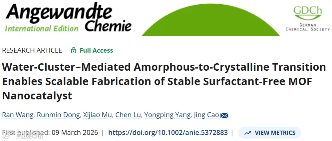 近日,来自兰州大学的曹靖教授团队,在国际知名期刊Angewandte Chemie International Edition上发表题为“Water-Cluster–Mediated Amorphous-to-Crystalline Transition Enables Scalable Fabrication of Stable Surfactant-Free MOF Nanocatalyst”的观点文章。该研究针对MOF光催化剂水稳定性差的难题,提出了一种水簇介导的非晶到晶相的相变策略,成功制备了无表面活性剂的高稳定性纳米催化剂,并揭示了水簇在稳定结构和促进电荷分离中的双重功能,实现了高效的光催化析氢性能。