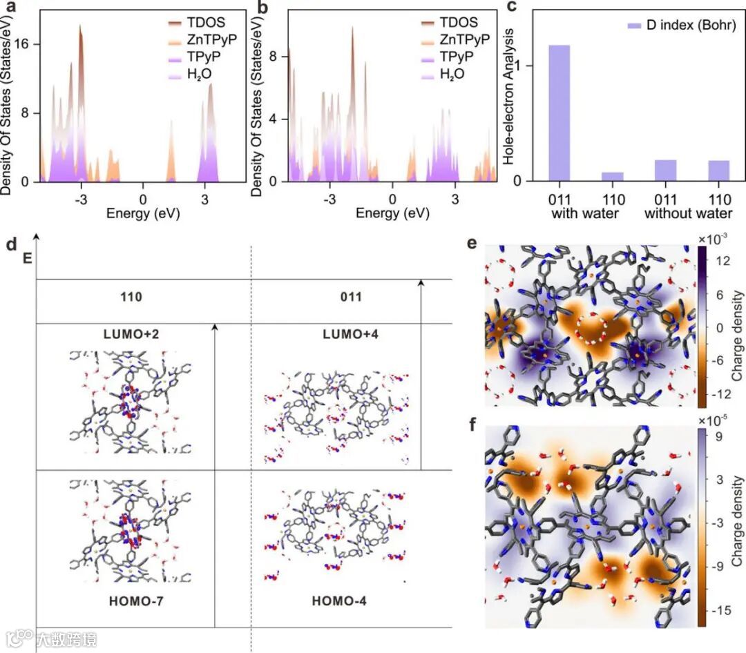 图4.晶态MOF的(011)和(110)晶面在不同水环境下的电子结构与激发态行为