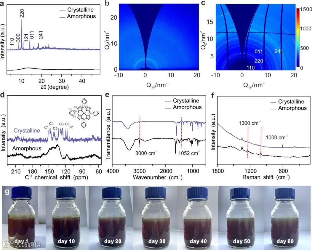 图2.无定形前驱体在水介导下成功转化为结构有序的晶态MOF,且该晶态样品在水相中表现出优异的长期稳定性