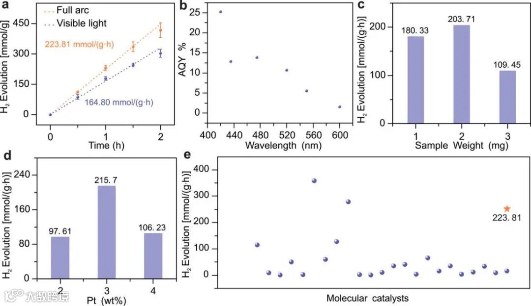 在该受限晶格中,水簇展现出双重功能:一方面作为结构稳定剂,使材料在水相中保持稳定超过两个月;另一方面作为陡峭的电位梯度阱,驱动电荷分离并将光生载流子导向催化中心。理论计算表明,水簇的存在显著增强了特定晶面(如(011)面)的电荷分离指数(D index),促进了激子解离。得益于高能晶面的择优暴露、纳米级形貌缩短的载流子迁移距离以及优化的能带结构(带隙1.80 eV),所制备的MOF纳米光催化剂实现了223.81 mmol g-1h-1的析氢速率和420 nm处25.2%的表观量子效率,在分子光催化剂中处于领先水平。该材料在连续催化循环后仍保持良好的结构稳定性和光学性能。