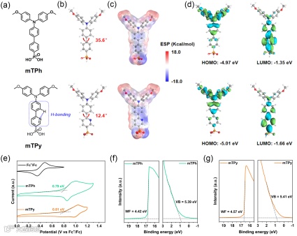 图 1. 分别为 mTPh 和 mTPy 的分子结构(a)、优化的基态几何构型(b)、计算得到的静电势(c)和前沿分子轨道(d);(e)mTPh 和 mTPy 的循环伏安曲线;mTPh(f)和 mTPy(g)的 UPS 光谱。