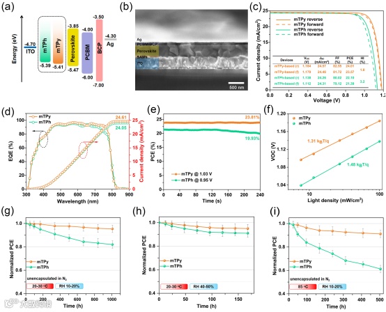 基于 mTPy 的倒置钙钛矿太阳能电池实现了24.01% 的冠军光电转换效率,开路电压(VOC)达1.184V,填充因子(FF)为82.55%,显著优于mTPh 基器件(22.10%),且迟滞指数仅 1.8%,电荷传输与复合特性更优。在稳定性方面,mTPy 基无封装器件表现出卓越性能:在氮气氛围、20-30℃条件下储存 1000h仍保留95% 的初始效率;在40-50%湿度的空气环境中储存7天,效率保持 95%;在 85℃高温氮气氛围下运行 500 h,效率仍维持 91% 以上,远优于 mTPh 基器件,这得益于 mTPy 优异的热稳定性(分解温度 315℃)和电化学稳定性。