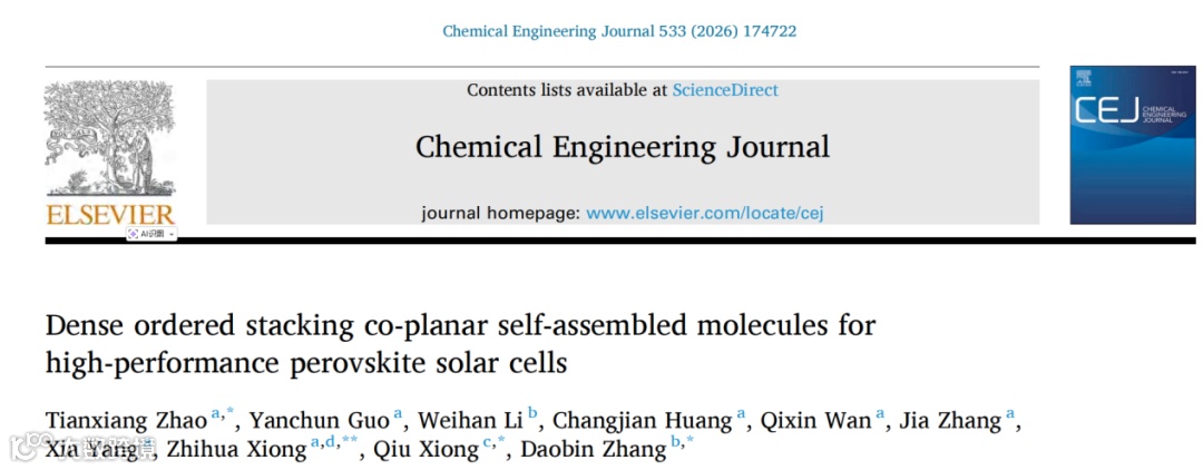 近日,江西科技师范大学熊志华教授团队,在国际知名期刊《Chemical Engineering Journal》(CEJ)发表题为 “Dense ordered stacking co-planar self-assembled molecules for high-performance perovskite solar cells” 的研究论文。该工作从共轭调控角度出发,设计合成了具有抗聚集和有序堆积特性的新型 SAMs 材料 mTPy,通过甲氧基三苯胺的空间扭转特性与吡啶单元构建的近共平面骨架结构,协同解决了传统 SAMs 分子聚集和无序堆叠的难题,显著优化了钙钛矿电池的界面特性与结晶质量,最终实现了效率达 24.01% 且稳定性优异的倒置钙钛矿太阳能电池。