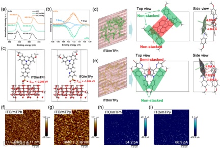 图 2. ITO、ITO/mTPh 和 ITO/mTPy 的 In 3d(a)和 P 2p(b)XPS 光谱;(c)通过 DFT 计算得出的 ITO 与 SAMs 之间的界面相互作用;mTPh(d)和 mTPy(e)的分子动力学计算结果及中间晶体结构;ITO/mTPh(f)和 ITO/mTPy(g)的 AFM分析;ITO/mTPh(h)和 ITO/mTPy(i)的 c-AFM分析。