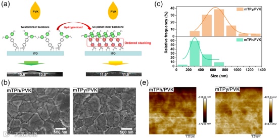 mTPy 因独特的结构设计,在 ITO 基底上展现出更高的覆盖率(89.7%)和更均匀的成膜效果,其根均方粗糙度仅 3.36 nm,远优于 mTPh(4.11 nm);且 mTPy 与 ITO 基底的吸附能更高,锚定作用更强,能形成致密的空穴传输层。同时,mTPy 基 SAMs 层对钙钛矿前驱体溶液润湿性更好,大幅提升了钙钛矿薄膜的结晶质量,其平均晶粒尺寸达 670 nm,远大于 mTPh 基薄膜的 370 nm,显著降低了薄膜缺陷密度。