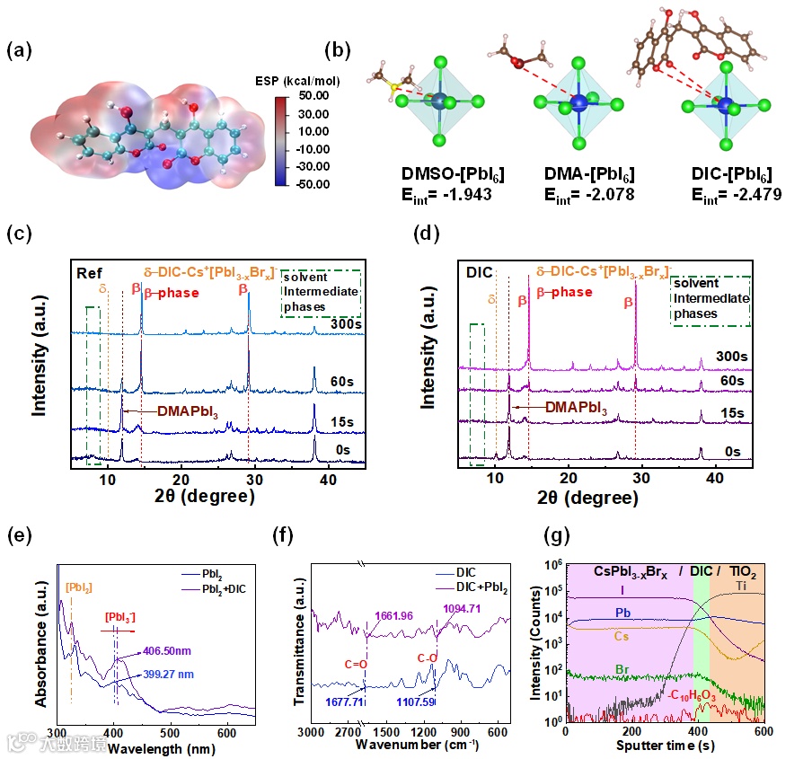 DIC 分子含吡喃氧原子、C=O 基团和 - OH 基团,可通过多重作用调控结晶过程:C=O 和 C-O 基团作为路易斯碱,通过孤对电子与 Pb²⁺空轨道形成共价键,-OH 基团与碘形成氢键,协同强化与 [PbI6]4⁻八面体的相互作用;同时,DIC 的热稳定性优异(分解温度 290℃,高于 210℃的退火温度),在结晶过程中定向迁移至钙钛矿 / TiO2埋底界面和晶界, 钝化 缺陷的同时不影响薄膜结晶完整性。