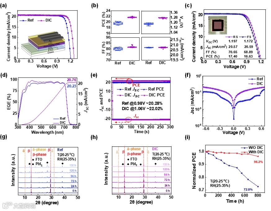 薄膜稳定性:在室温(20-25℃)、相对湿度 25-35% 的空气中暴露 192 小时,参考薄膜完全降解为黄色 δ 相,而 DIC 修饰薄膜仍保留大部分黑色相,XRD 测试显示 120 小时后 β-CsPbI3-xBrx相仍占主导; -