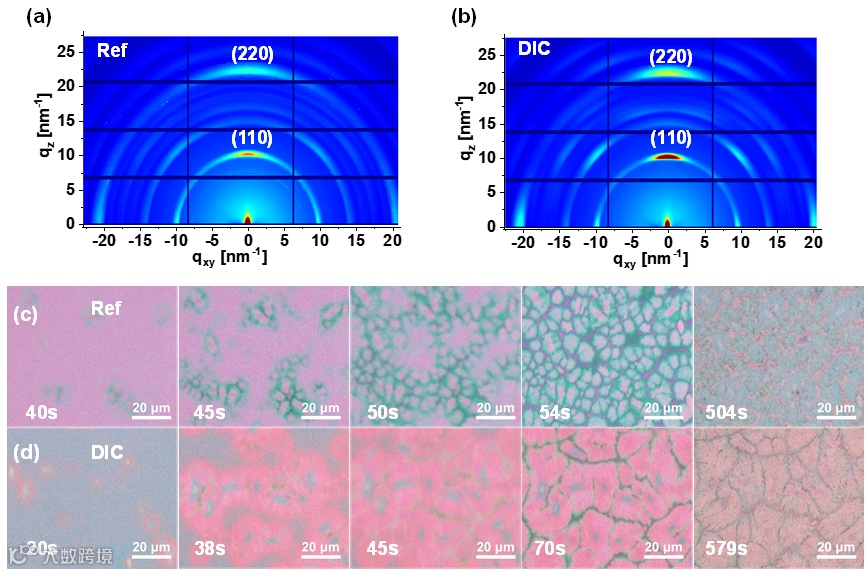 这种相互作用抑制了传统溶剂中间相形成,加速溶剂挥发,使结晶动力学发生显著变化:DIC 修饰的薄膜成核时间从 40 s 缩短至 20 s,生长时间从 14 s 延长至 50 s,Avrami 指数从 3.57 降至 3.10,表明结晶机制从 “连续成核三维生长” 转变为 “瞬时成核三维生长”,最终形成晶粒更大(平均晶粒尺寸从 0.59 μm 增至 0.97 μm)、均匀性更佳、残余拉伸应变显著释放(斜率从 0.071 降至 0.014)的高质量薄膜。