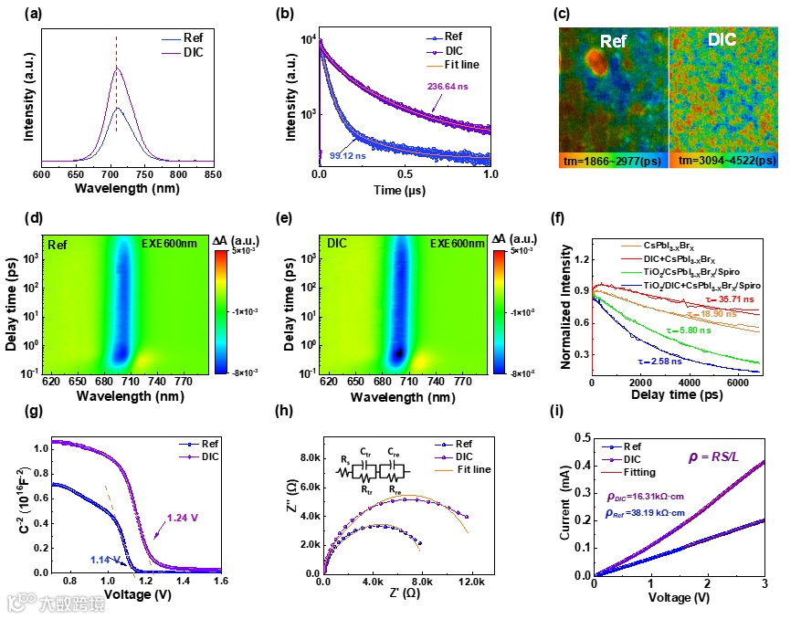 表征结果显示:DIC 修饰的薄膜稳态光致发光(PL)强度显著增强,时间分辨 PL(TRPL)寿命从 99.12 ns 延长至 236.64 ns,飞秒瞬态吸收光谱(TAS)测得的载流子寿命从 18.90 ns 提升至 35.71 ns;器件内置电势(Vbi)从 1.14 V 增至 1.24 V,串联电阻降低、复合电阻增大,电荷分离与传输效率显著提升,暗电流减小,进一步优化了光伏性能。