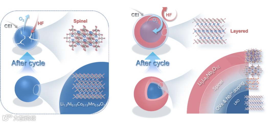 通过原位构建策略,研究团队在富锂正极表面形成了“LLNO 涂层-尖晶石过渡层–层状主体”三位一体的分级界面结构。该连续结构有效缓解了涂层与层状主体之间的结构与晶格失配问题,其中尖晶石过渡层作为结构缓冲区,既保持了与层状主体的晶格相容性,又提供了三维锂离子扩散通道。相比于直接形成无序岩盐相的界面重构路径,该分级结构显著降低了应力集中与结构塌陷风险,抑制了过渡金属向锂层迁移及层状结构向岩盐相的不可逆转变,从结构层面提升了富锂正极在高电压循环过程中的稳定性。