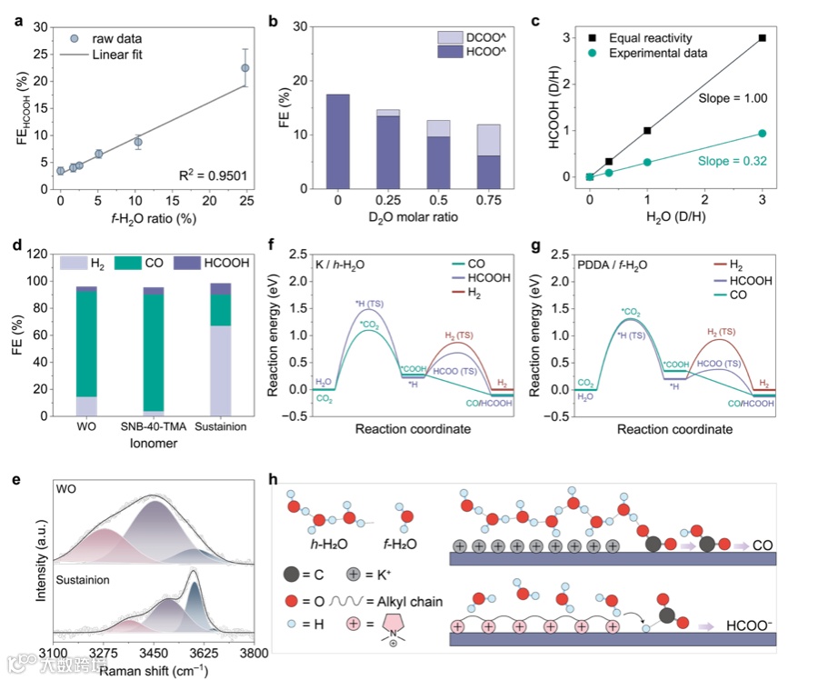 实验结果表明HCOOH法拉第效率与f-H₂O比例呈线性关系(R²=0.95)。同位素实验进一步证实,当D₂O比例增加时HCOOH生成明显降低。DFT计算表明,在PDDA/f-H₂O环境中水更容易形成表面吸附氢(H),并与CO₂反应生成HCOOH,其中H→HCOO⁻反应能垒仅0.38 eV,明显低于生成H₂的0.93 eV,说明该环境更有利于HCOOH生成。