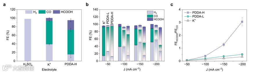 在0.1 M H₂SO₄电解液中仅检测到H₂生成,说明在酸性体系中阳离子对于CO₂还原反应是必不可少的。当加入0.16 M K₂SO₄后,Ag催化剂表现出典型CO选择性,产物比例FE(HCOOH)/FE(CO)为0.39。而当使用5 wt% PDDA-H替代K⁺后,产物分布明显变化,PDDA体系中FE(HCOOH)/FE(CO)提高至3.05,表明电解质环境可以显著改变反应路径。