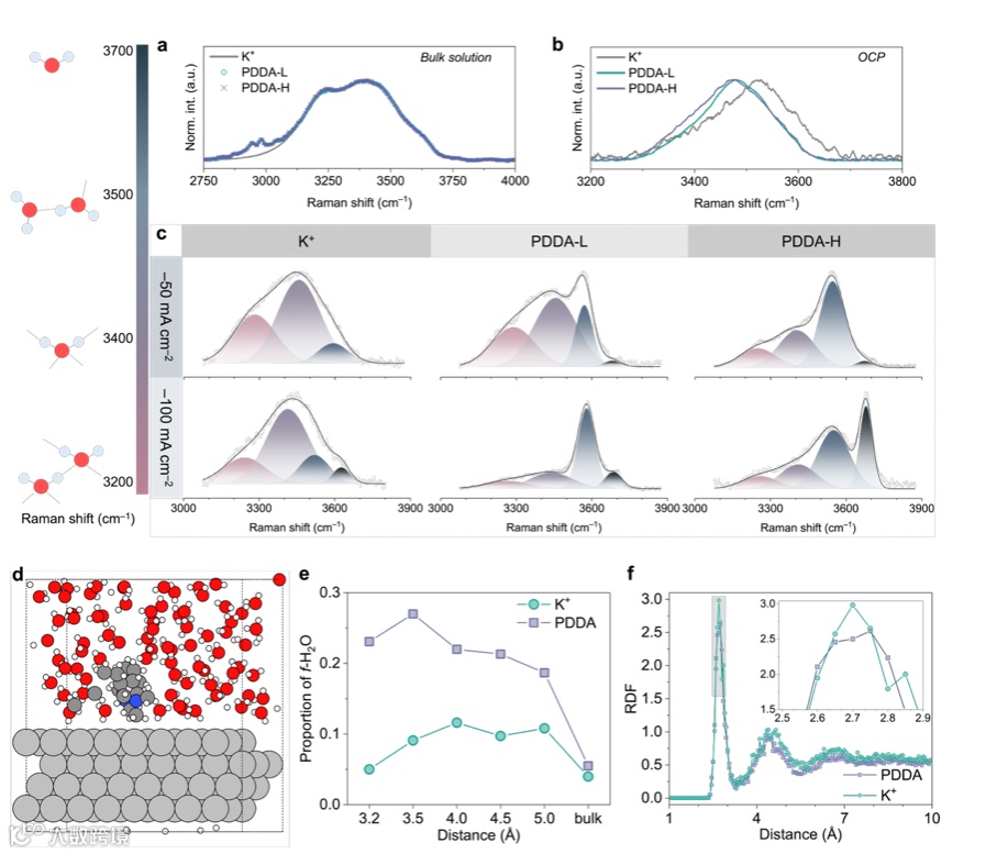 原位Raman光谱显示,在PDDA电解质中出现约3700 cm⁻¹的高频振动峰,对应弱氢键水(f-H₂O)。与PDDA-L相比,高分子量PDDA-H体系中该信号更强,说明界面区域富集了更多f-H₂O。AIMD模拟结果表明,在电极表面约3.2 Å处,PDDA体系中f-H₂O比例比K⁺体系高约4.6倍,表明PDDA在界面形成疏水环境并削弱了水分子的氢键网络。