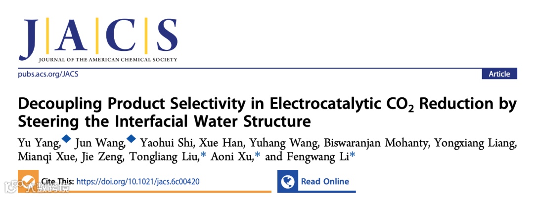 近日,悉尼大学李逢旺、徐奥妮和刘同亮研究团队在Journal of the American Chemical Society上发表题为“Decoupling product selectivity in electrocatalytic CO₂ reduction by steering interfacial water structure”的研究论文。该工作通过在酸性电解液中引入聚阳离子电解质PDDA,在电极界面构建疏水环境,从而富集弱氢键水(free-like water,f-H₂O)。研究发现,界面水结构的变化会影响反应过程中关键中间体的形成方式,使Ag催化剂的反应路径由传统的CO生成转向HCOOH生成。通过原位Raman、ATR-FTIR、EPR以及分子动力学和DFT计算等多种方法,研究人员系统揭示了界面水结构对CO₂电还原反应路径的调控机制,为通过界面微环境工程调控电催化反应选择性提供了新的思路。