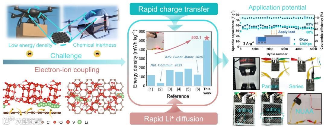 近日,来自南京航空航天大学的朱孔军教授、申来法教授与东南大学的胡林峰教授合作,在国际知名期刊Advanced Materials上发表题为“Graphene-Vanadium Oxide Heterojunction Boosting Electron-Ion Coupling for Ultrahigh Energy Density Carbon Fiber Structural Supercapacitors”的文章。该研究提出了一种简单高效的一步高温混合法(HTMM)来合成H2V3O8/rGO异质结。研究人员首次使用H2V3O8/rGO作为电极涂层制备了碳纤维结构超级电容器(H2V3O8/rGO@CF-SSC)。系统地研究了H2V3O8/rGO@CF-SSC的电化学性能、载荷下的电容保持率、机械拉伸性能和安全性能。