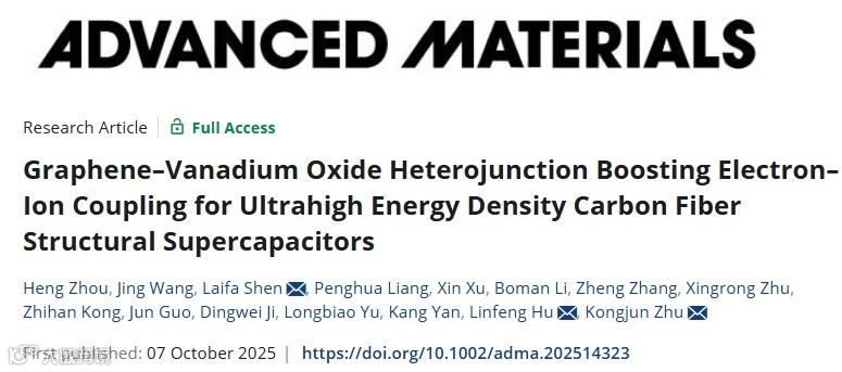 H. Zhou, J. Wang, L. Shen, et al. “ Graphene–Vanadium Oxide Heterojunction Boosting Electron–Ion Coupling for Ultrahigh Energy Density Carbon Fiber Structural Supercapacitors.” Adv. Mater. (2025): e14323.
