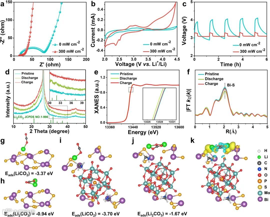 图 6. 反应机理探究:(a) 有/无光照下的EIS图;(b) 有/无光照下的CV曲线;(c) 有/无光照下基于GITT模式的充电电压曲线;(d) 光照下Bi2S3-PMA SNWs正极在不同循环阶段的XRD谱图;(e, f) 光照下不同循环阶段Bi L3边的XANES与FT-EXAFS谱图;(g, h) Bi2S3对LiCO2中间体及Li2CO3的吸附能;(i, j) Bi2S3-PMA SNWs对LiCO2中间体及Li2CO3的吸附能;(k) Li2CO3吸附在Bi2S3-PMA SNWs上的电荷密度差图(黄色为电荷积累,蓝色为电荷损失)。