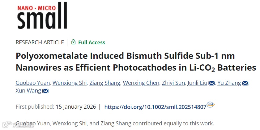 近日,北京航空航天大学刘俊利副教授、张瑜教授团队联合清华大学王训教授团队,在国际知名期刊Small上发表题为“Polyoxometalate Induced Bismuth Sulfide Sub-1 nm Nanowires as Efficient Photocathodes in Li-CO2Batteries” 的研究论文。该团队通过在硫化铋反应体系中引入磷钼酸 (PMA) 团簇,成功制备了一种新型的由多酸团簇诱导的Bi2S3-PMA SNWs。受益于独特的亚纳米结构以及Bi2S3和PMA的强协同作用,SNWs表现出增强的光吸收能力、匹配良好的能带结构以及高效的光生载流子分离/传输能力。其作为光辅助Li-CO₂电池正极催化剂时,实现了低过电位与超长循环寿命的双重突破,为硫化物亚纳米材料的合成与储能器件应用提供了全新思路。