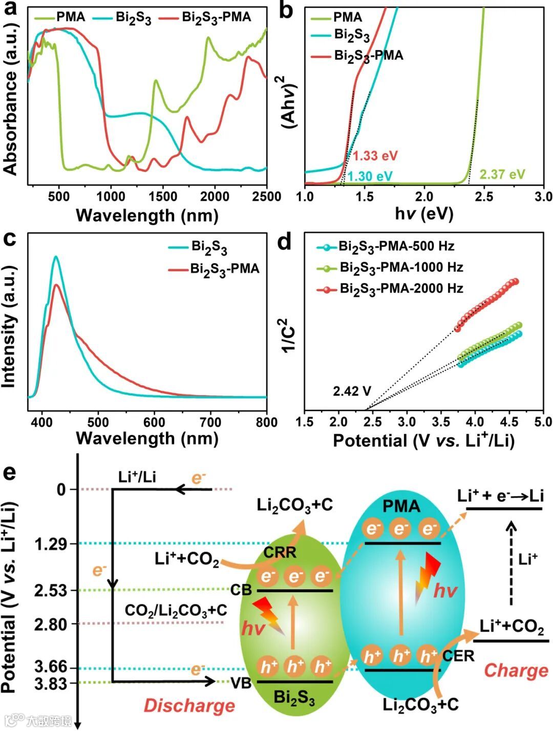 图 4. Bi2S3-PMA SNWs的带隙与能带结构:(a) Bi2S3、PMA 及 Bi2S3-PMA SNWs的UV-vis-NIR光谱;(b) 基于UV-vis-NIR光谱的Tauc 图;(c) Bi2S3与 Bi2S3-PMA SNWs的PL光谱;(d) Bi2S3-PMA SNWs的M-S图谱;(e) 光辅助Bi2S3-PMA SNWs基Li-CO2电池的工作机理示意图。