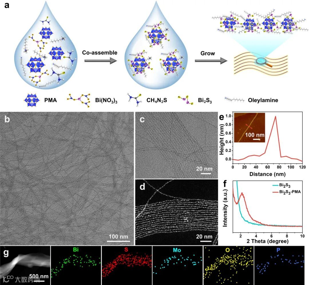 图1. Bi2S3-PMA SNWs的设计与初步表征:(a) 合成流程示意图;(b, c) TEM图像;(d) HAADF-STEM图像;(e) AFM测试结果;(f) Bi2S3与Bi2S3-PMA SNWs的SAXRD谱图;(g) Bi2S3-PMA SNWs的HAADF-STEM图像及其对应的元素分布。