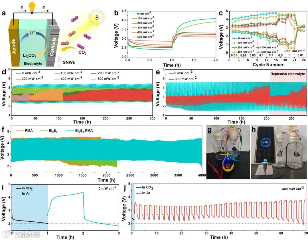 图 5. Li-CO2电池的电化学性能:(a) Bi2S3-PMA SNWs作为正极催化剂的电池结构示意图;(b) 0.01 mA cm-2下不同光功率密度的充放电曲线;(c) 不同光功率密度下的倍率性能;(d) 0.01 mA cm-2 下不同光功率密度的循环稳定性;(e) 0.05 mA cm-2 下有/无光照的循环性能(含电解液补充测试);(f) 无光照条件下PMA、Bi2S3及Bi2S3-PMA SNWs基电池的长循环测试;(g, h) 两个串联的电池点亮LED、为手机充电的实物图;(i, j) 先在CO₂氛围放电、后切换至Ar氛围的充放电曲线(无光照/有光照)。