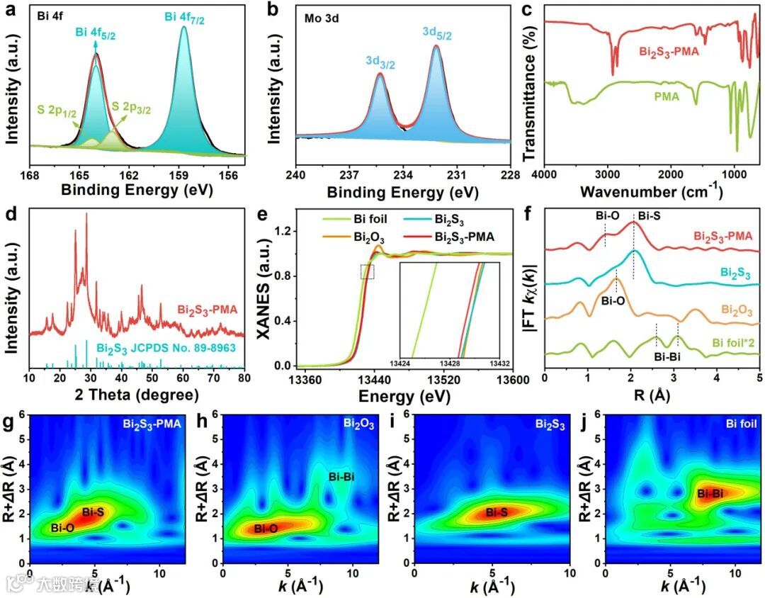 图 2. Bi2S3-PMA SNWs的组分表征:(a) Bi 4f 与 S 2p 的XPS谱图;(b) Mo 3d 的 XPS 谱图;(c) PMA 与Bi2S3-PMA SNWs的FT-IR谱图;(d) Bi2S3-PMA SNWs的XRD谱图;(e) Bi L3边的XANES谱图;(f) Bi L3边的FT-EXAFS谱图;(g-j) Bi2S3-PMA SNWs、Bi2O3、Bi2S3及Bi片的EXAFS小波变换分析图。