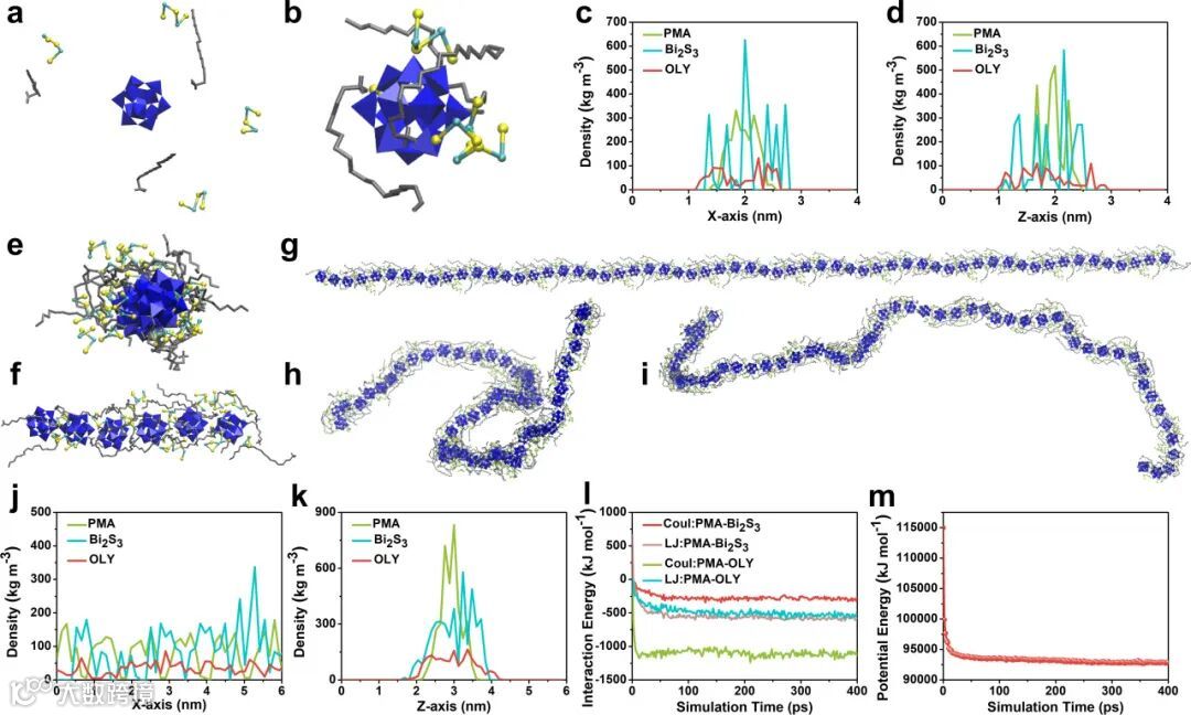 图 3. MD模拟:(a) 初始构筑模型(PMA簇、Bi2S3分子与油胺配体);(b) Bi2S3-PMA SNWs的组装基元;(c, d) 组装基元中各组分沿X轴、Z轴的密度分布;(e, f) 6个组装基元形成纳米线的轴向与侧向图;(g-i) 短纳米线沿1维方向组装、生长形成更长柔性纳米线的示意图;(j, k) 纳米线中各组分沿X轴、Z轴的密度分布;(l) PMA、Bi2S3与油胺之间的相互作用能曲线;(m) 亚纳米线组装过程的势能变化曲线。