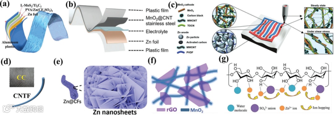 图2.水系凝胶态柔性锌离子电池的组成及代表性举例