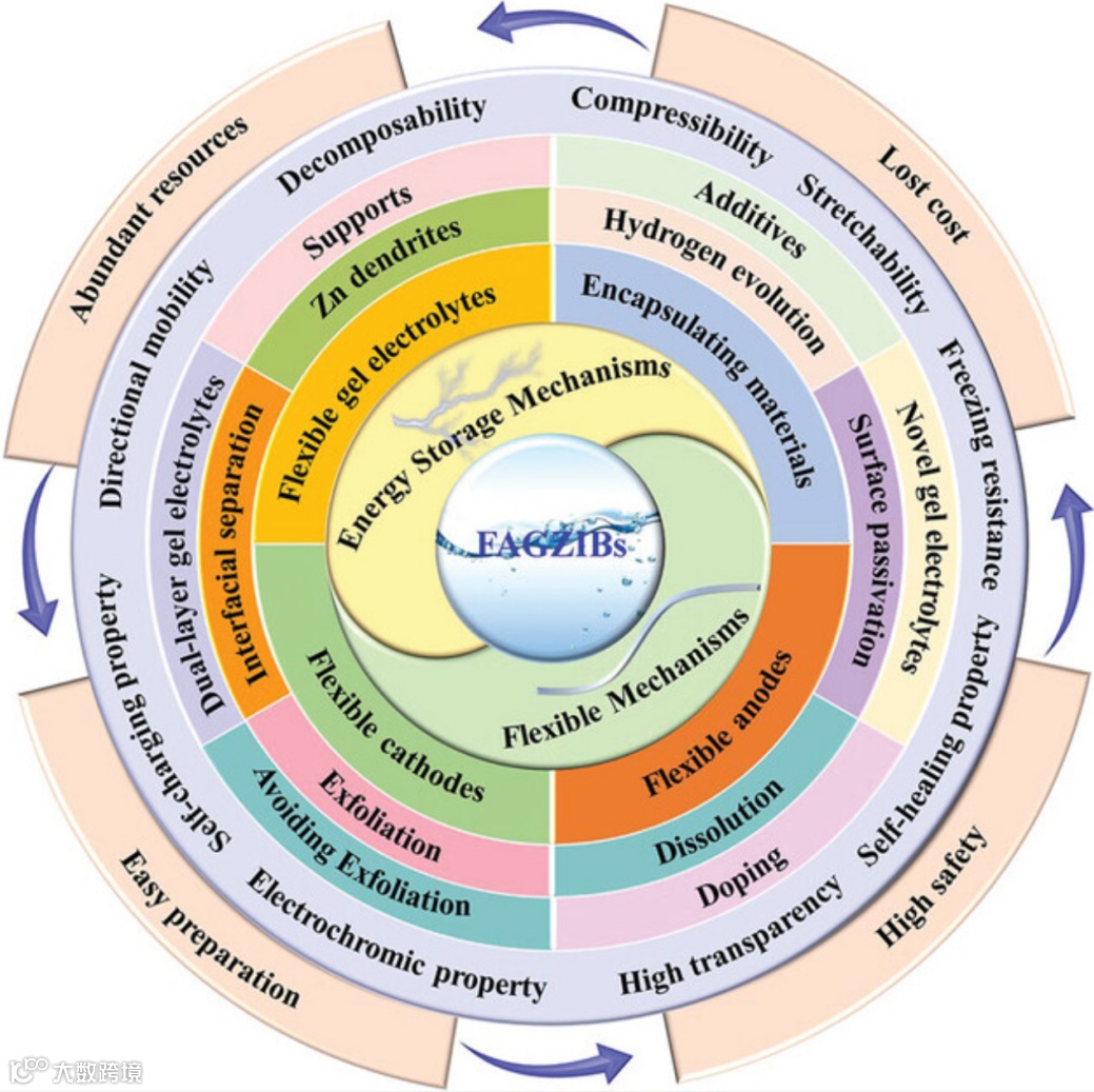 基于此,来自南京大学、安阳师范学院的研究团队在《Advanced Functional Materials》期刊发表了题为“Rational Constructions of High-Performance Flexible Aqueous Gel-State Zinc Ionic Batteries”的综述文章。文章系统梳理了FAGZIBs的组成结构、储能原理、柔性机制、当前面临的挑战及解决策略,并重点介绍了其在多功能集成(如可压缩、可拉伸、自愈合、电致变色、自充电等)和可穿戴电子器件中的应用,如图1所示。文章旨在为FAGZIBs的研究与开发提供一定的借鉴。