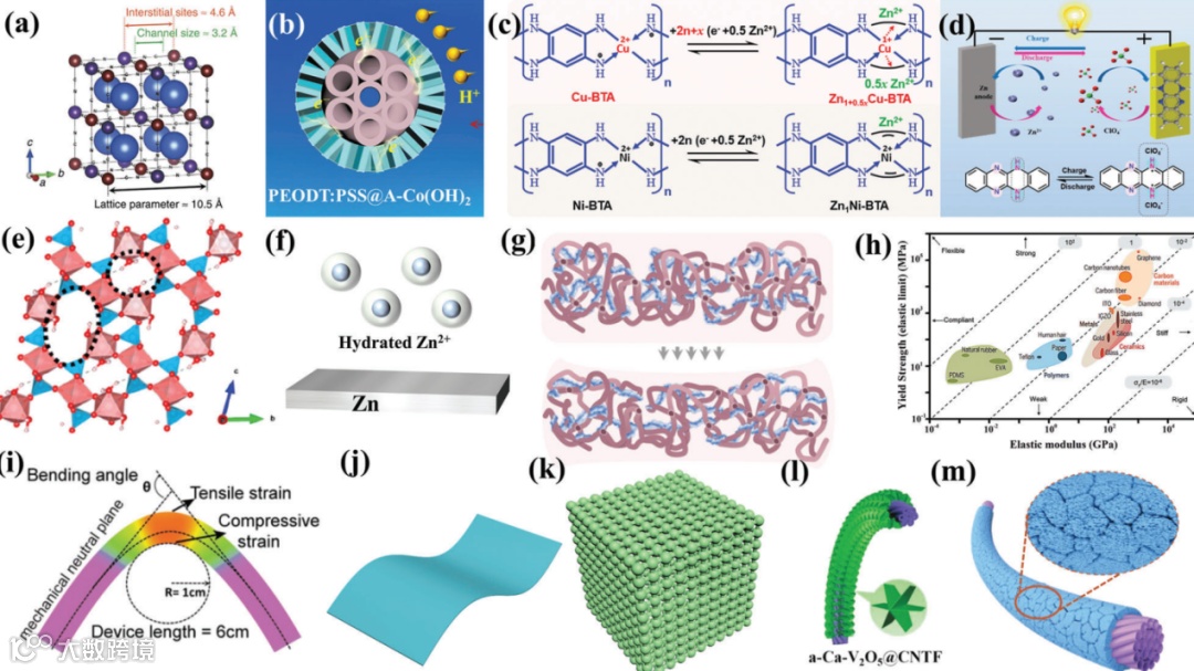 一般情况下,正极材料的电化学储能机制可分为离子从正极活性材料中的嵌入/脱出、转化反应和配位反应。负极材料的电化学储能机制可分为离子从负极活性材料中的嵌入/脱出和金属锌的剥离/沉积。柔性机理是如何降低机械应力,一般可分为通过降低材料厚度、引入孔隙、构建阵列或微裂纹结构、设计波形/岛桥/折纸等结构,分散应力,提升柔韧性,如图3所示。