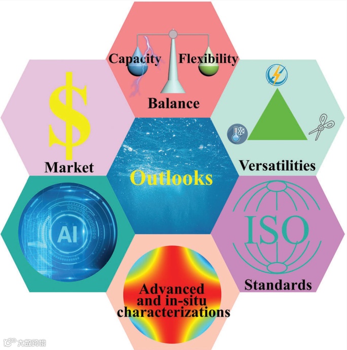 本文对FAGZIBs的研究进展进行了全面系统的综述:FAGZIBs的组成和结构,储能机制和柔性机理,存在问题和解决方案,以及FAGZIBs的最新进展和实际应用。尽管在提高FAGZIBs性能方面取得了一些重大进展,但是FAGZIBs的发展仍处于起步阶段。因此,一些进一步的研究值得关注 (如图5所示)。1、电池性能和机械柔性的平衡;2、多功能性;3、评价标准;4、先进表征和原位表征;5、人工智能赋能FQAZIBs的发展;6、应用市场的扩展,如图4所示。