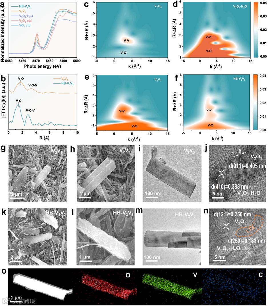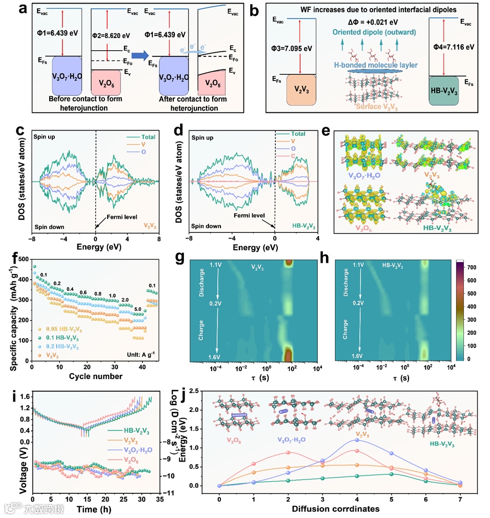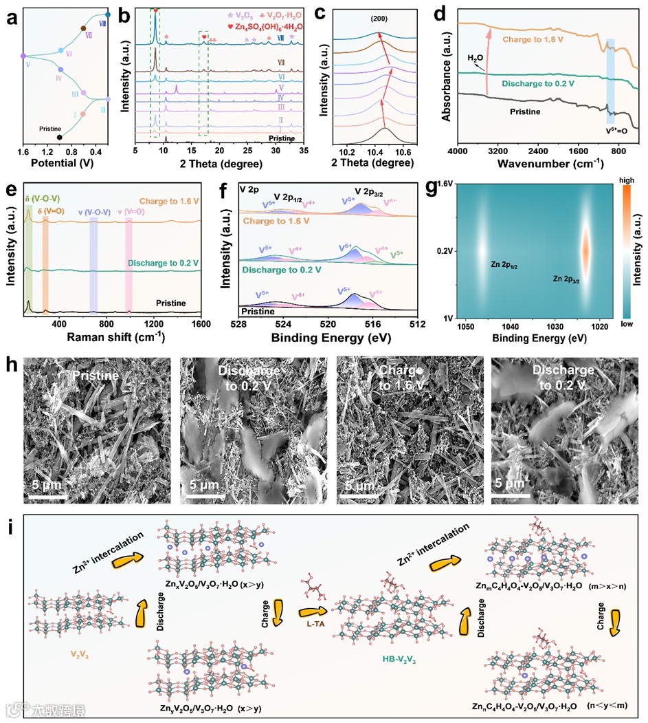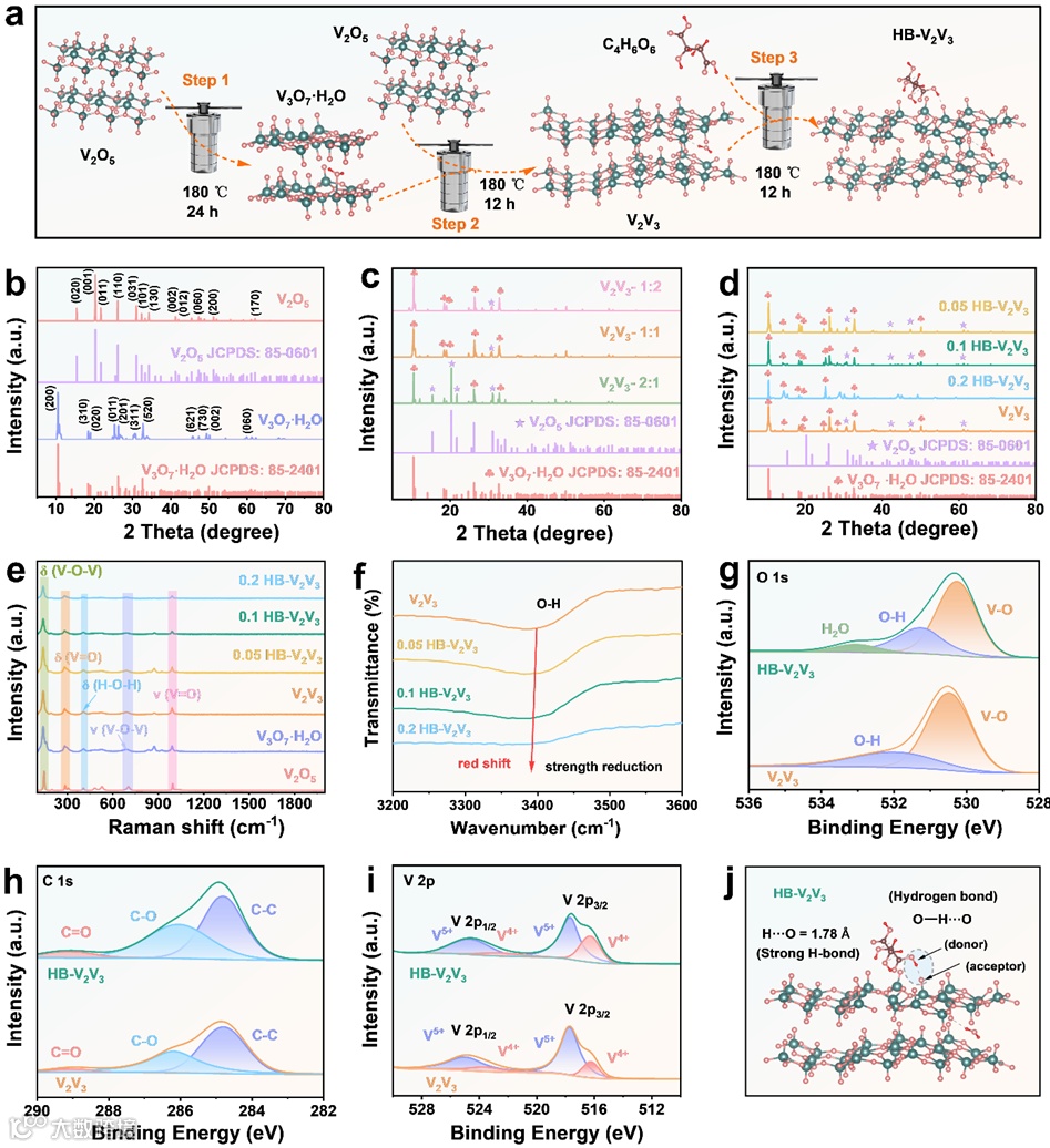 基于理论设计,通过三步水热法成功构建了L-酒石酸介导的V2O5/V3O7·H2O异质界面材料。结构表征系统验证了该策略的有效性,证实了异质结构的成功构筑,且L-TA的引入未改变主体晶相,表明其修饰具有非侵入性。拉曼与红外光谱显示,随着L-TA的引入,界面氢键网络得到增强,自由水活性显著降低。XPS分析进一步证实L-TA成功吸附于材料表面,并诱导形成了稳定的氢键界面水,同时未扰动钒的主体电子结构。理论计算支持的示意图表明,L-TA在界面形成了强氢键网络。综合表征结果表明,L-TA在异质界面构建了一个稳固的超分子氢键层。该界面层在不破坏晶体结构的前提下,有效增强了界面稳定性并优化了局部化学环境,为提升电极的电化学性能奠定了关键的结构基础。