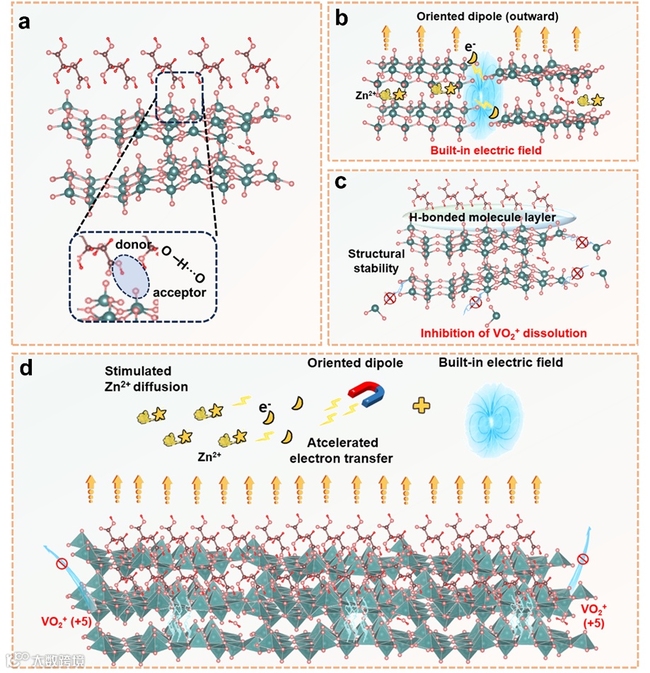 氢键网络通过界面分子工程在异质界面构建了定向排列的分子结构。其核心作用机制在于:该网络诱导产生的界面定向偶极,与异质结固有的内建电场发生偶极-电场协同耦合,从而形成显著增强的界面电场。这一强化电场直接优化了界面电子结构,增加了费米能级附近的态密度并促进电荷再分布,显著增强了界面电子耦合与电荷转移效率。同时,增强的界面电场为Zn²⁺迁移提供了更强的定向驱动力,有效降低了其跨界面传输的活化能垒。氢键网络本身也对传输通道产生调控,形成更有序的界面环境。通过这种电子耦合强化与离子传输促进的双重协同机制,氢键网络系统性地提升了界面的电荷转移动力学与Zn²⁺迁移速率。