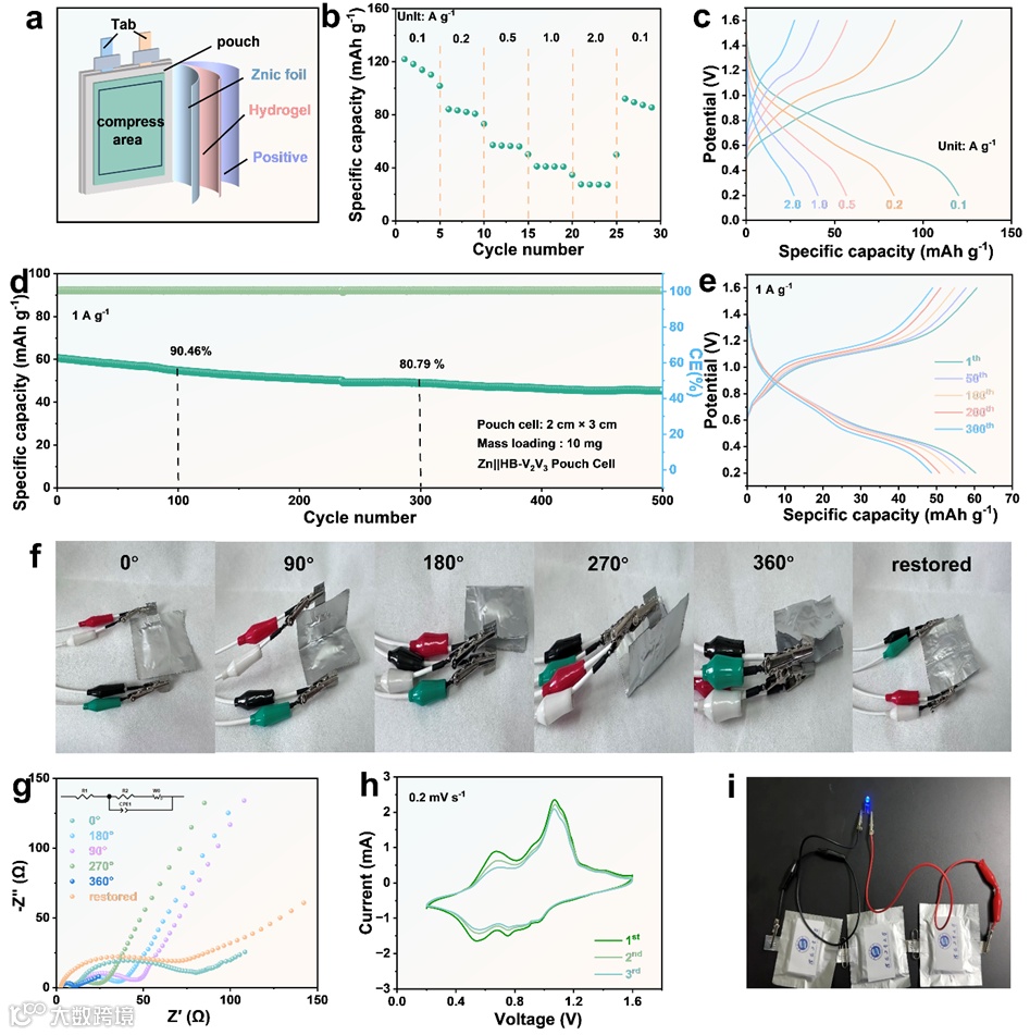 将HB-V2V3正极与凝胶电解质结合,构筑了柔性软包电池,系统评估了其实际应用性能。电池展现出良好的倍率性能与容量保持能力,充放电曲线稳定、极化小,得益于氢键界面层保障的快速动力学。在1 A g⁻¹下循环300次后容量保持率约81%,库伦效率接近100%,且充放电曲线高度重叠,表明界面耐久、结构完整。弯曲测试中,随着弯曲角度增加,电池电荷转移阻抗不升反降,归因于压力改善的界面接触;恢复平整后阻抗可逆,体现了优异的机械-电化学耦合稳定性。循环伏安曲线在长期运行中峰形与面积保持稳定,证实活性位点与反应动力学得以维持。最终,该软包电池可稳定点亮LED,直观验证了其器件级应用潜力。