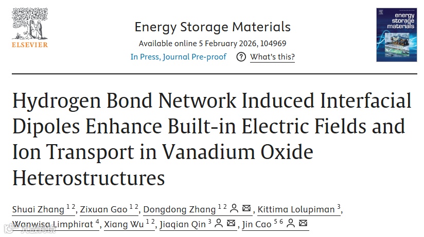 近日,来自泰国朱拉隆功大学的秦家千教授,三峡大学的曹金副教授与沈阳工业大学的张东东副教授合作,在国际知名期刊Energy Storage Materials上发表题为“Hydrogen Bond Network Induced Interfacial Dipoles Enhance Built-in Electric Fields and Ion Transport in Vanadium Oxide Heterostructures”的观点文章。该观点文章分析了在水系锌离子电池中钒氧化物正极材料在实际应用中面临的核心问题(结构不稳定、活性物质溶解、界面传输动力学迟缓)。提出了一种“非共价分子界面工程”策略,通过将L-酒石酸(L-TA)在预构建的V2O5/V3O7·H2O异质界面自组装,形成氢键界面层。该氢键网络增强了界面内聚力并诱导定向偶极,与异质结内建电场协同作用,强化了电子耦合并加速了锌离子传输。同时,增强的钒-氧相互作用和受调控的界面水合环境有效抑制了钒溶解,维持了晶格完整性。这种非侵入且柔顺的分子“鞘层”可在保持主体晶格结构的同时调控局部化学环境。该设计显著提升了电池的离子传输效率与长循环稳定性,为发展高性能、耐用的水系锌离子电池正极材料提供了新颖而有效的界面工程思路。