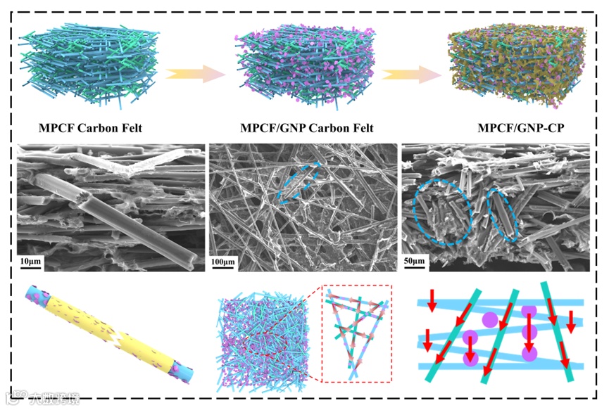 通过将中间相沥青基碳纤维与聚丙烯腈基碳纤维共同分散成毡构建纤维骨架,并将碳纸浸渍石墨纳米片分散液使石墨纳米片附着于碳纤维表面。在这种结构中,MPCFs一部分水平搭接在相邻的 PAN-CFs之间,一部分竖直穿插在由 PAN-CFs形成的碳纸的层间空隙中,为碳纸水平方向和厚度方向的导热导电网络建立了额外的传导路径,从而提高了碳纸的导热导电性能。此外,石墨纳米片附着在碳纤维表面,形成了更细的分支通道,使碳纸的导热导电网络更加复杂,从而能够进一步提高电导率和热导率,得到具有优异导热导电性能的改性碳纸。