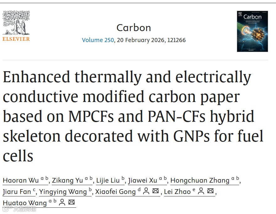 近日,来自哈尔滨工业大学(威海)大学的王华涛教授、宫晓飞教授和研究生吴浩然,与来自哈尔滨工业大学的赵磊教授合作,在国际知名期刊Carbon上发表题为“Enhanced thermally and electrically conductive modified carbon paper based on MPCFs and PAN-CFs hybrid skeleton decorated with GNPs for fuel cells”的文章。该文章通过将中间相沥青基碳纤维与聚丙烯腈基碳纤维共同分散成毡的工艺构建纤维骨架,并浸渍石墨纳米片分散液使石墨纳米片附着于碳纤维表面,从而增强了燃料电池用碳纸的力学强度以及导热、导电性能。