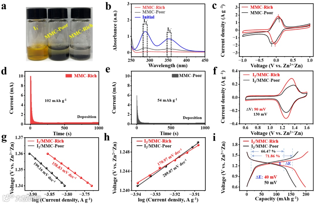 图3 (a) MMC-Poor与MMC-Rich在4 mM I3−溶液中的吸附能力测试及(b)相应的紫外−可见吸收光谱。(c) MMC-Poor与MMC-Rich对称电池的CV曲线。碘在(d) MMC-Rich及(e) MMC-Poor上的沉积曲线。(f) I2/MMC-Rich与I2/MMC-Poor电池的CV曲线,(g, h)相应的塔菲尔斜率及(i)充放电曲线。