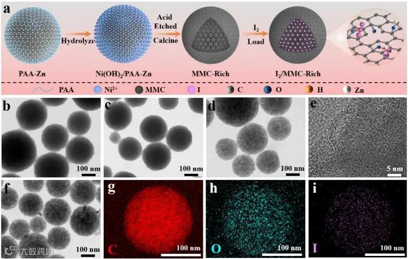 图1 (a) I2/MMC-Rich制备过程示意图。(b) PAA-Zn纳米球、(c) Ni(OH)2/PAA-Zn及(d) MMC-Rich纳米球的透射电镜图像。(e) MMC-Rich的高分辨透射电镜图像。(f) I2/MMC-Rich的透射电镜图像及(g−i)元素分布图。