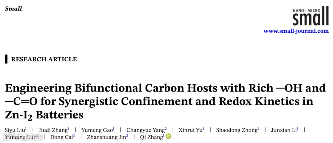 近日,来自吉林农业大学张琪博士、罗云清教授与河北北方学院金占双教授、温州大学蔡冬副教授合作,在国际知名期刊Small上发表题为“Engineering Bifunctional Carbon Hosts with Rich −OH and −C=O for Synergistic Confinement and Redox Kinetics in Zn-I2 Batteries”的观点文章。该观点文章设计并合成了一种富含羟基(−OH)和羰基(−C=O)的分级微介孔碳纳米球(MMC-Rich),用作锌碘电池正极宿主材料,并实现了明确的协同分工。具体来说,−OH通过O−H∙∙∙I键显著增强了对碘物种的化学吸附,从而抑制穿梭效应。此外,−C=O基团积极参与额外的法拉第氧化还原反应,提高电池容量。得益于这种协同机制,结合多级孔的物理限域作用,基于MMC-Rich的锌碘电池表现出优异的电化学性能,在10 A g−1高电流密度下,初始容量达160.87 mAh g−1,循环25,000次后仍保持135.58 mAh g−1,容量保持率高达84%。