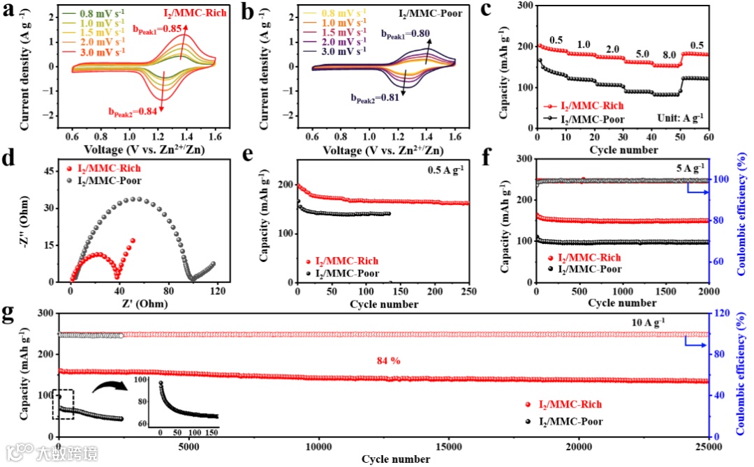 图4 (a) I2/MMC-Rich与(b) I2/MMC-Poor在不同扫描速率(0.8至3.0 mV s−1)下的CV曲线。(c) I2/MMC-Rich与I2/MMC-Poor正极的倍率性能及(d) 电化学阻抗谱。I2/MMC-Rich与I2/MMC-Poor正极在(e) 0.5 A g−1、(f) 5 A g−1及(g) 10 A g−1电流密度下的循环性能。