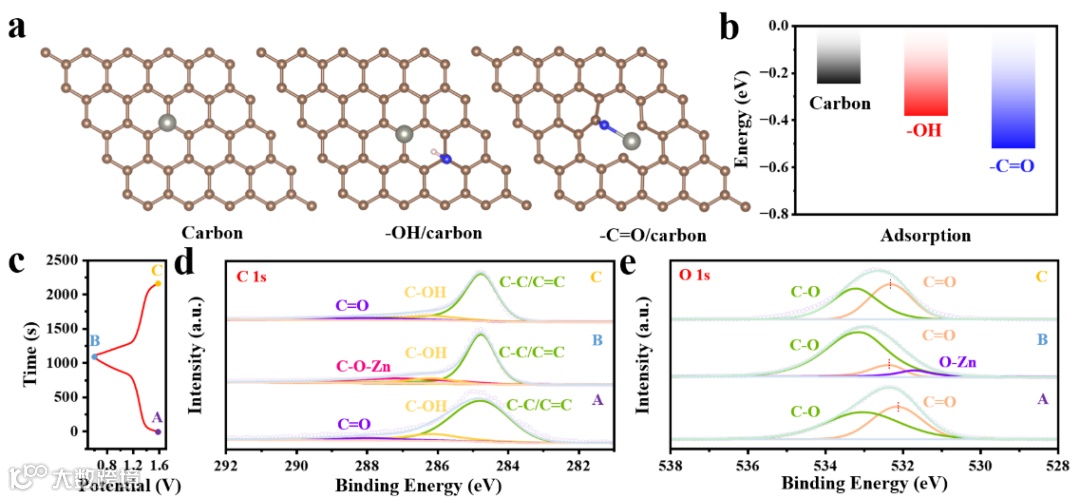 图5 (a) 具有不同含氧官能团的碳基体的理论几何构型。(b) 不同含氧官能团对Zn2+吸附能。(c) I2/MMC-Rich电极的充放电曲线。对应的非原位XPS谱图:(d) C 1s谱与(e) O 1s谱。