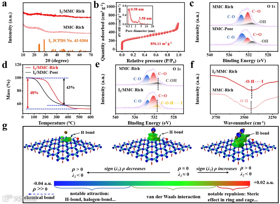 图2 (a) I2/MMC-Rich与MMC-Rich的XRD图。(b) MMC-Rich的氮气吸附-脱附等温线及孔径分布图(插图)。(c) MMC-Rich与MMC-Poor的高分辨率O 1s XPS谱图。(d) 氩气气氛下I2/MMC-Rich与I2/MMC-Poor的热重分析曲线。(e) MMC-Rich与I2/MMC-Rich的高分辨率O 1s XPS谱图及(f) 傅里叶红外光谱图。(g) −OH官能团与碘物种的相互作用区域指示函数(IRI),蓝色区域显示氢键作用。