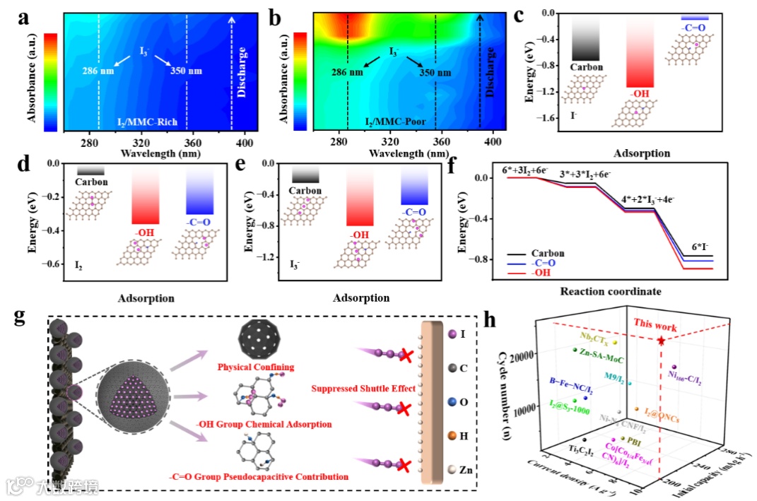 图6 (a) I2/MMC-Rich 与 (b) I2/MMC-Poor 在放电过程中的原位紫外−可见光谱。 (c) I−、 (d) I2、 (e) I3− 在纯碳、−OH/碳和−C═O/碳基体上的吸附能。 (f) 碘还原反应在纯碳、−OH/碳和−C═O/碳基体上的吉布斯自由能变化。 (g) I2/MMC-Rich 电池的工作机理示意图。 (h) I2/MMC-Rich 作为正极的电池性能与已报道正极的电池性能对比图。