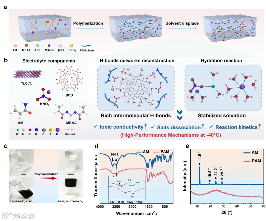 图1 水凝胶电解质的设计原理与聚合。a, b) PAM/M-βCD/KNO3水凝胶制备流程示意图及分子间相互作用机理;c) PAM与PAM/M-βCD/KNO3水凝胶聚合反应前后的光学图片;d) AM单体与PAM聚合物傅里叶变换红外光谱;e) AM单体与PAM聚合物X射线衍射图谱。