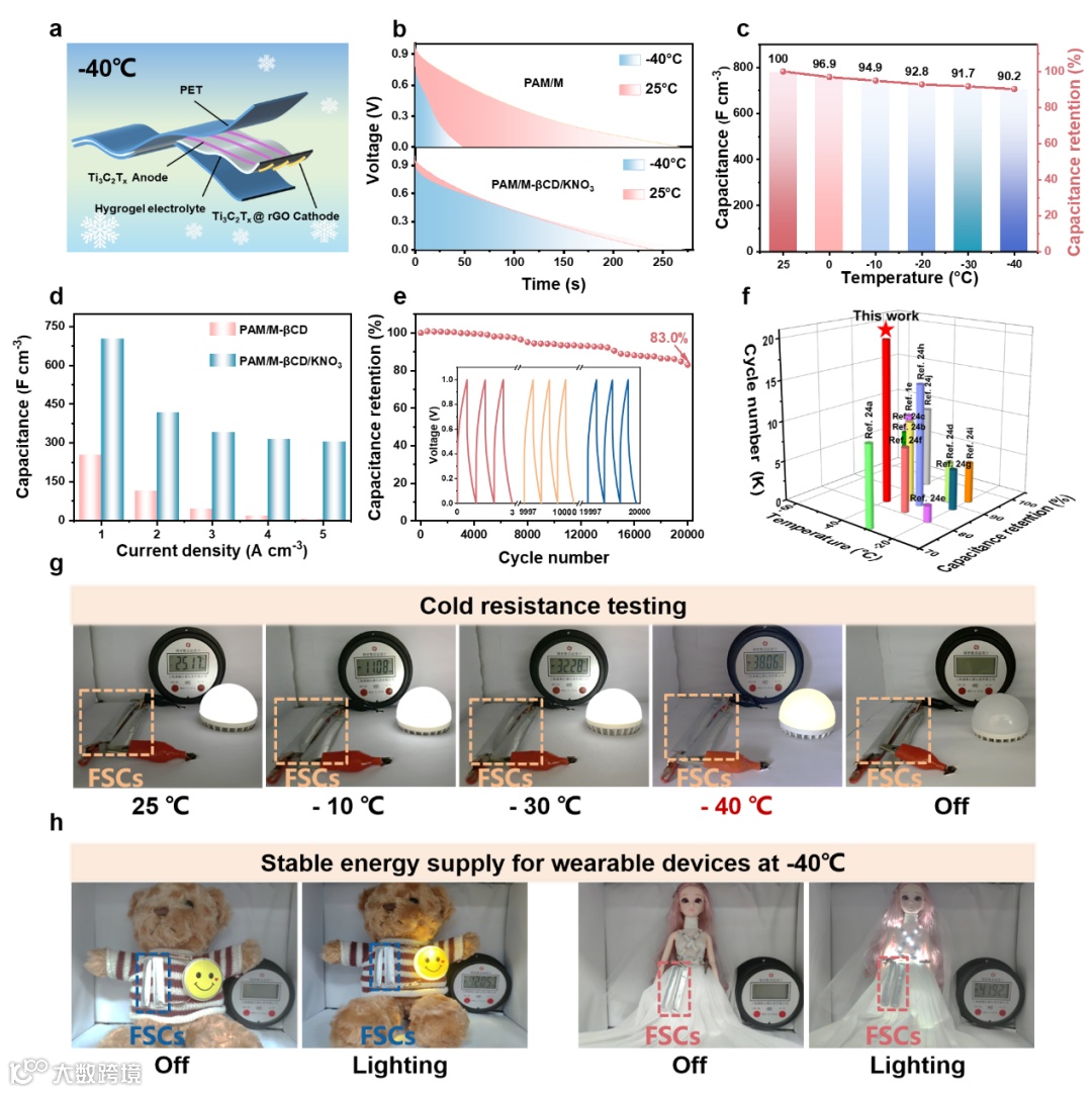 基于PAM/M-βCD/KNO3凝胶电解质的FSCs在-40℃下表现出优异的电化学性能。其在1.0 A cm-3电流密度下具有701.9 F cm-3的高容量,室温容量保持率高达90.2%;在引入0.3 mM 的KNO3后,FSCs在5.0 A cm-3大电流密度下仍然能保持303.8 F cm-3的容量,显示出优异的倍率特性;在8.0 A cm-3下循环20,000次后容量保持率仍达83.0%,表现出优异的长循环稳定性。