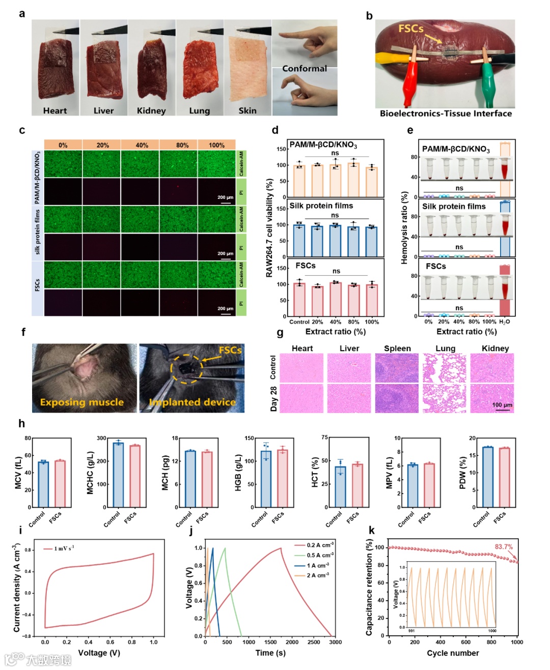 图5 丝素蛋白封装的固态纤维基超级电容器生物相容性与体内电化学性能研究。a) 丝素蛋白膜对多种猪组织(心脏、肝脏、肾脏、肺脏及皮肤)的粘附性能与弯曲适应性;b) 纤维基超级电容器集成于猪肾脏的光学图片;c) PAM/M-βCD/KNO3凝胶电解质、丝素蛋白膜及纤维基超级电容器中钙黄绿素-AM/PI染色RAW264.7细胞的荧光显微图像;d) RAW264.7细胞与不同浓度PAM/M-βCD/KNO3凝胶电解质、丝素蛋白膜及纤维基超级电容器的浸提液共培养后的细胞活性;e) PAM/M-βCD/KNO3凝胶电解质、丝素蛋白膜及纤维基超级电容器的溶血测试(数据以均值±标准差表示,n=3;"ns"表示无统计学显著性差异);f) 纤维基超级电容器植入大鼠皮下组织过程示意图;g) 植入28天后大鼠器官(心、肝、脾、肺、肾)染色切片,显示正常组织形态结构;h) 植入组与对照组血液分析指标对比(MCV、MCHC、MCH、HGB、HCT、MPV、PDW);i) 植入式纤维基超级电容器的循环伏安曲线;j) 植入式纤维基超级电容器的恒流充放电曲线;k) 植入式纤维基超级电容器的电容保持率。