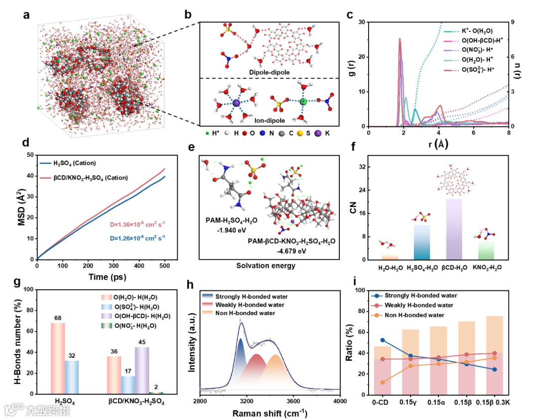 图2 不同电解质体系在-40°C下的溶剂化构型与相互作用机制的理论与实验研究。a) βCD/KNO3-H2SO4电解质的分子动力学模拟快照;b) βCD/KNO3-H2SO4电解质的分子间配位作用与溶剂化结构示意图;c) βCD/KNO3-H2SO4电解质中K+与H+的径向分布函数;d) H2SO4与βCD/KNO3-H2SO4电解质中阳离子的均方位移;e) 通过DFT模拟获得的PAM-H2SO4-H2O与PAM-βCD-KNO3-H2SO4-H2O电解质结合能(注:较低Eb值表征更强相互作用);f) βCD/KNO3-H2SO4电解质中配位数;g) 分子动力学模拟得到的H2SO4与βCD/KNO3-H2SO4电解质中各类氢键统计数量;h) βCD/KNO3-H2SO4电解质拉曼拟合曲线:蓝色、红色与橙色峰分别对应强/弱/无氢键作用的O−H伸缩振动(强氢键源于水分子间作用,弱氢键来自βCD、NO3-等与水分子作用,无氢键组分源于超分子对水分子结构的破坏);i) 基于拉曼拟合峰面积计算的强/弱/无氢键水分子占比(柱状图为弱氢键与无氢键水分子总量)。