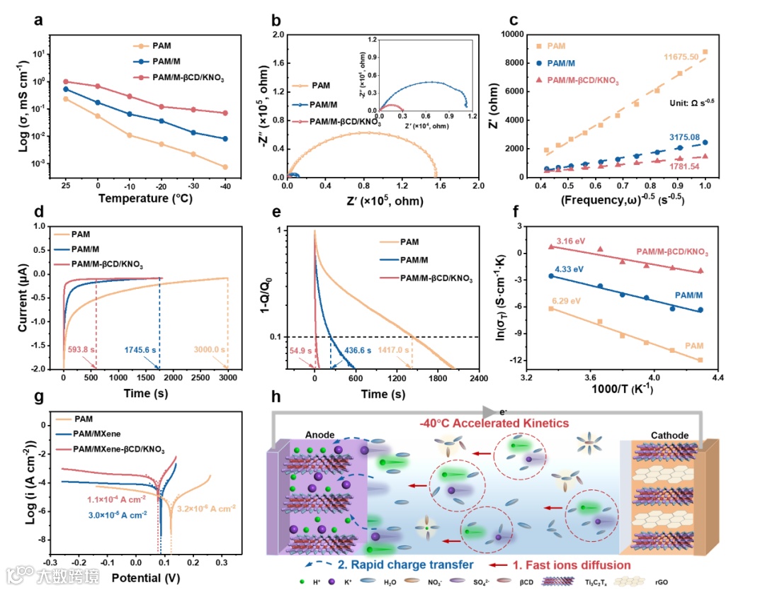 图3 PAM、PAM/M及PAM/M-βCD/KNO3水凝胶电解质在-40°C下的动力学行为分析。a) 基于PAM、PAM/M及PAM/M-βCD/KNO3凝胶器件的阻抗测试获得的不同温度下离子电导率;b) 基于PAM、PAM/M及PAM/M-βCD/KNO3凝胶电解质的固态纤维基超级电容器的电化学阻抗谱;c) 中频区阻抗实部(Z′)与角频率平方根倒数(𝜔−0.5)的关系曲线;d) 基于PAM、PAM/M及PAM/M-βCD/KNO3凝胶电解质的固态纤维基超级电容器的电流响应;e) 基于PAM、PAM/M及PAM/M-βCD/KNO3凝胶电解质的固态纤维基超级电容器的1-Q/Q0随时间变化半对数图(Q₀为初始电荷量);f) PAM、PAM/M及PAM/M-βCD/KNO3水凝胶电解质的阿伦尼乌斯电导率图谱;g) PAM、PAM/M及PAM/M-βCD/KNO3水凝胶电解质的塔菲尔曲线;h) PAM/M-βCD/KNO₃水凝胶电解质中离子传输机制示意图。