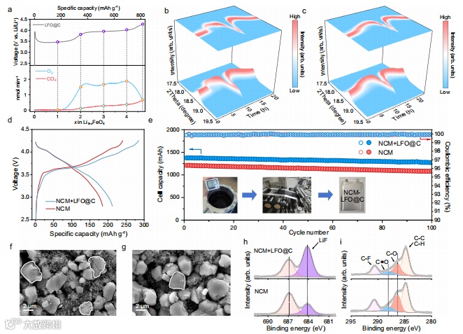 将LFO@C引入商用NCM811正极,并在中试线完成软包电池组装测试,验证其工程化可行性。测试结果显示,LFO@C不仅提升了电芯的能量输出,还显著改善了材料结构稳定性。通过电芯拆解与失效分析发现,LFO@C可有效缓解正极颗粒开裂、减少界面膜不均、抑制Fe元素迁移,形成更致密均匀的CEI膜,进一步提升了体系的化学稳定性与循环可靠性,为Li₅FeO₄作为预锂化添加剂在实际电池体系中应用提供了坚实支撑。